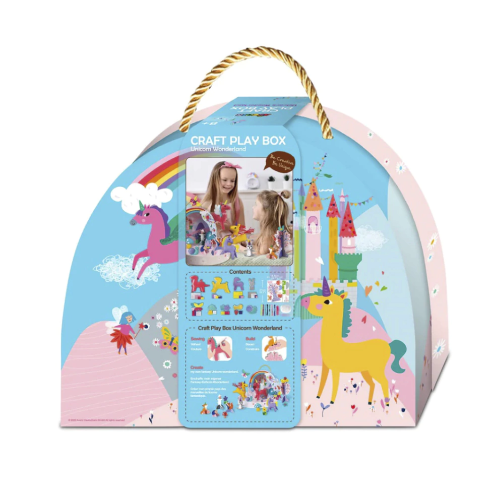 Descubrí el Craft box crea y juega en un mágico universo de Unicornios, una valija encantadora que transporta a los niños al maravilloso mundo de los unicornios. Este kit combina actividades de creatividad y costura, permitiendo que los más chicos diseñen y decoren un escenario lleno de fantasía.