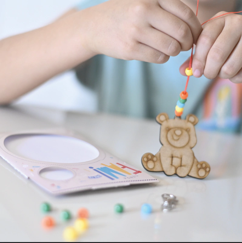 Con el hilo, las cuentas, el osito de madera y el ganchito, se arma un hermoso colgante para usar en las mochilas o llevar del bolsillo.